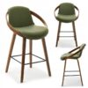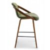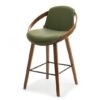 The LAGOS bar stool features a modern design with an elegant finish. Its seat and backrest are upholstered in green faux leather, offering a stylish look and comfort. A distinctive decorative ring made of bent wood in a walnut color adds unique character and elegance. The wooden legs ensure stability and durability, while a black metal footrest enhances comfort.