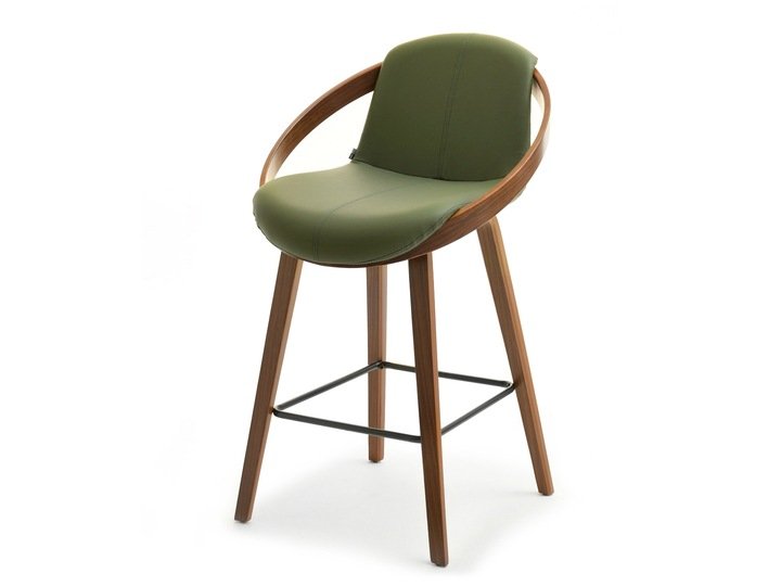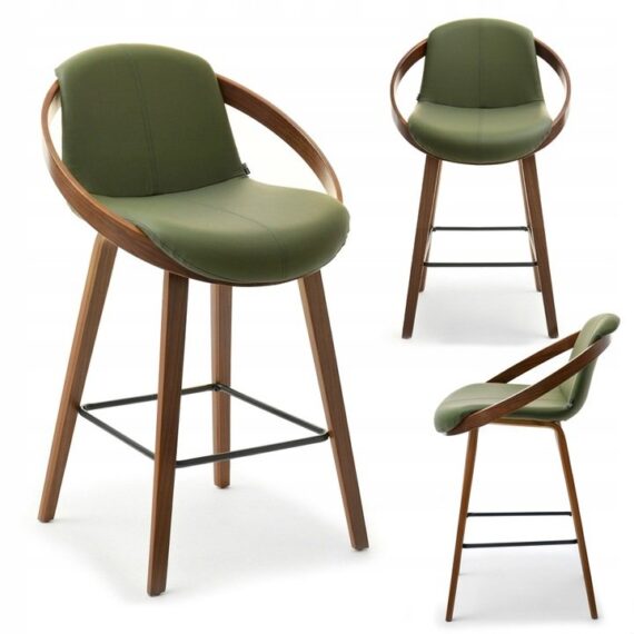 The LAGOS bar stool features a modern design with an elegant finish. Its seat and backrest are upholstered in green faux leather, offering a stylish look and comfort. A distinctive decorative ring made of bent wood in a walnut color adds unique character and elegance. The wooden legs ensure stability and durability, while a black metal footrest enhances comfort.